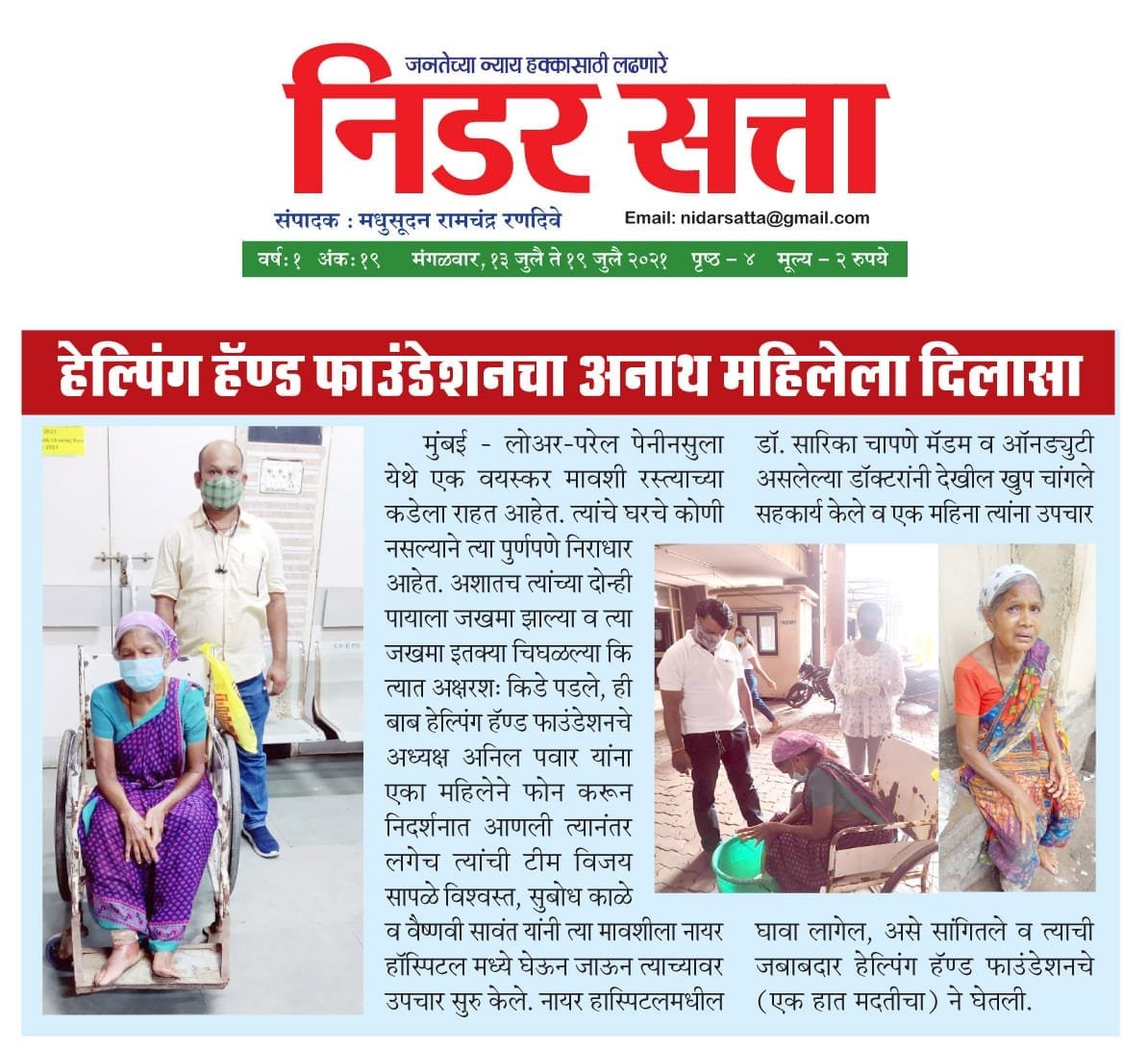 An elderly aunt lives on the side of the road near Peninsula in Lower Parel, Mumbai. She is destitute as she has no one at home. In the same way, they have wounds on both their legs and the wounds are so chewy that they are literally infested with insects. The matter was brought to the notice of Anil Pawar, the president of Helping Hand Foundation, by a woman on the phone.