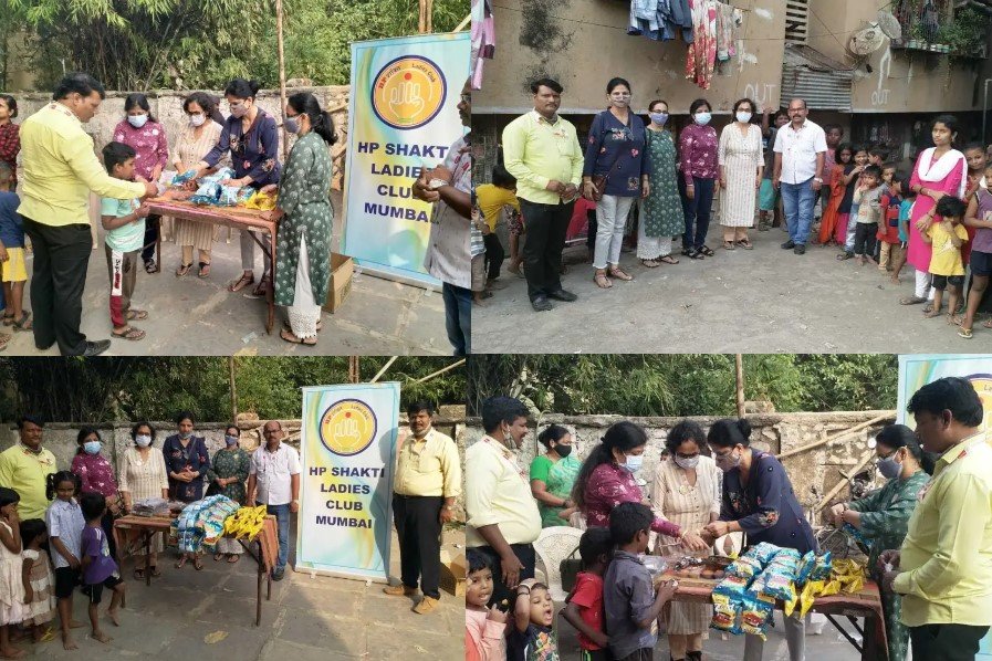 On 16/12/2021 at Mariamma Nagar, * Helping Hand Foundation (NGO) * and * HP Shakti Ladies Club Mumbai * distributed food to children (Biscuit Fruity Cake Wafer).