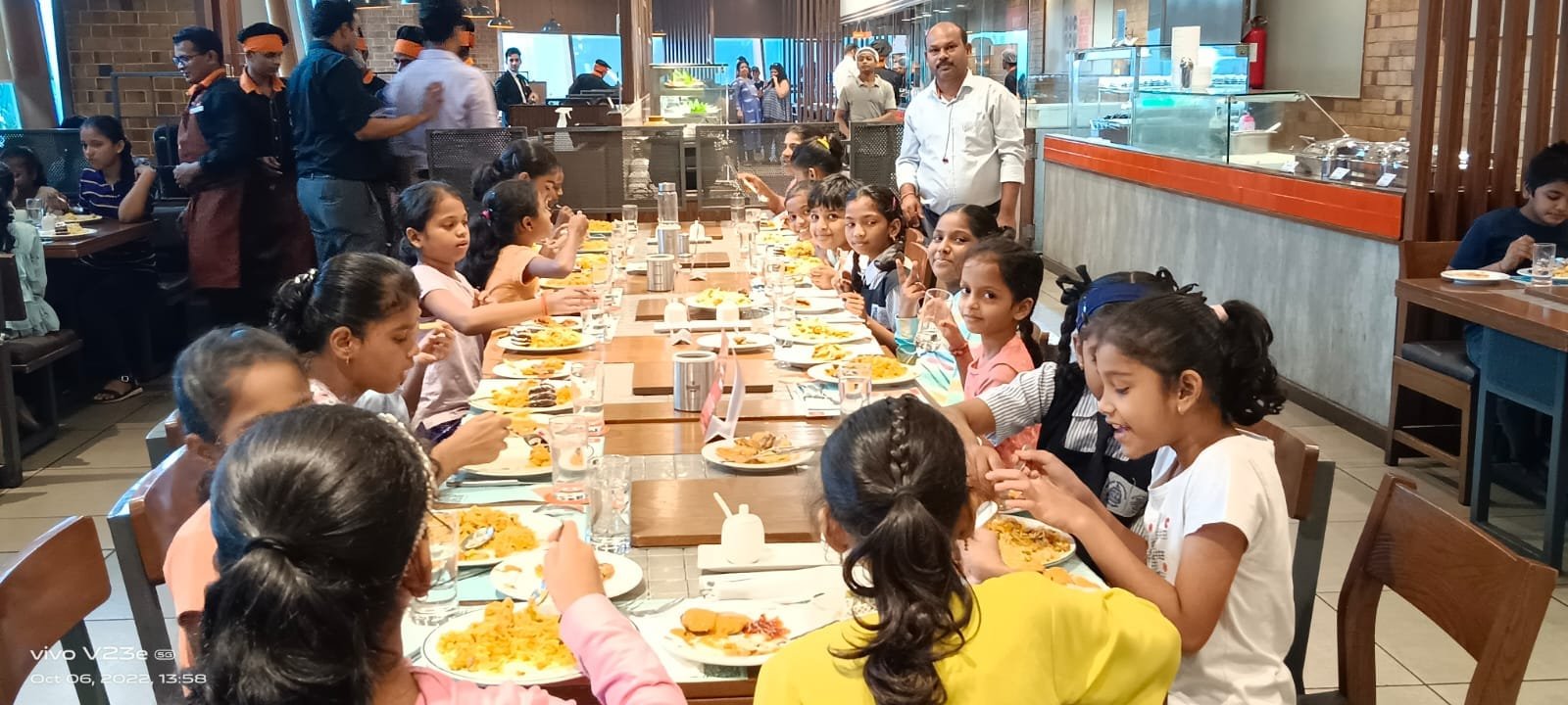 On 6.10.2022, on behalf of Helping Hand Foundation, 110 students of Mahalakshmi Public School (Akansha) were organized at Atria Mall 4th Floor Barbeque Nation for lunch and distribution of school supplies.